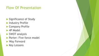 This document provides an overview of Procter & Gamble (P&G) and its Gillette brand in India. It discusses P&G's global presence and financial highlights. It then profiles Gillette's product portfolio and pricing in India. The document analyzes Gillette's marketing strategy (4Ps) in India and conducts a SWOT analysis and Porter's Five Forces analysis. It identifies opportunities for P&G in private labels and emerging markets and concludes with lessons around supplier diversification and the need for innovation in competitive markets.