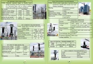This document provides specifications for various electrical equipment used in traction substations for electric rail systems. It includes ratings for isolators, current and potential transformers, circuit breakers, power transformers, lightning arrestors, and other equipment. It also provides guidelines for busbar layout and clearances, earthing arrangements, transformer characteristics, and voltage and temperature protections. The key equipment and their ratings at a sample 132kV traction substation with a 30/42MVA power transformer are also listed.