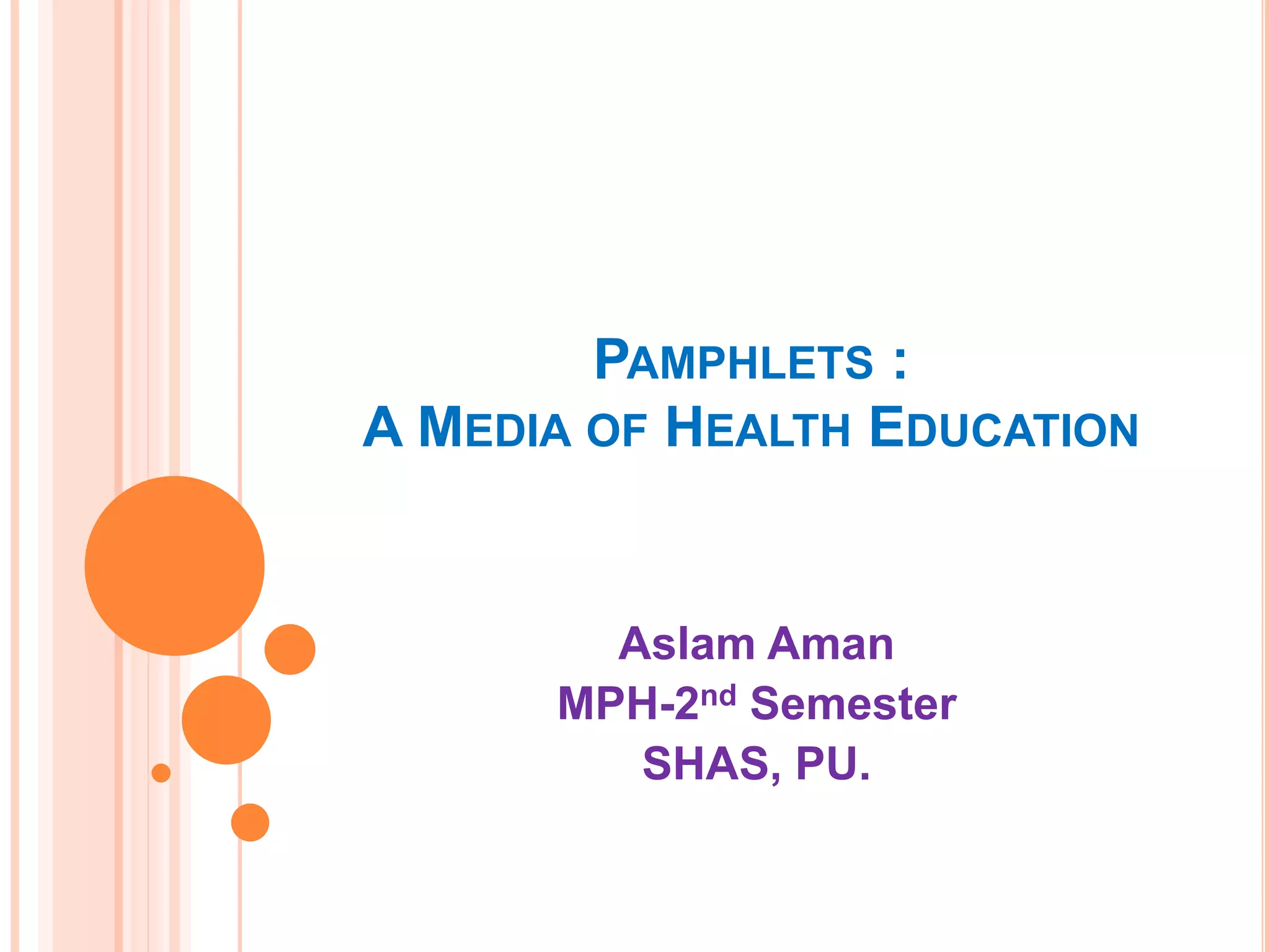 The document discusses pamphlets as a form of health education media. Some key points made include: