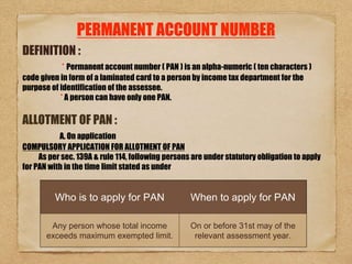 The document defines a Permanent Account Number (PAN) as a 10-character alphanumeric code issued by the income tax department to identify taxpayers. PAN is mandatory for certain individuals and entities, including those with income above a threshold, or involved in certain business transactions. It must be quoted on all tax-related documents and correspondence. Failure to apply for or quote PAN can result in penalties. PAN details are also required for transactions like opening bank accounts, purchasing vehicles, mutual funds or property to curb tax evasion.