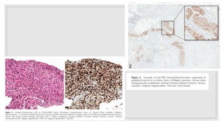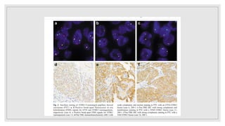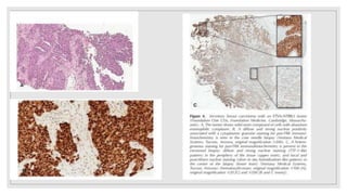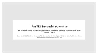 Pan-trk is an immunohistochemical marker used to detect overexpression of NTRK protein fusions linked to various tumors, particularly secretory carcinomas and pediatric tumors. NTRK fusions are considered oncogenic drivers and have been identified in over 20 tumor types, with varying frequency across different cancer morphologies. The sensitivity and specificity of pan-trk IHC make it a valuable tool for diagnosis, although confirmatory testing with methods like ETv6 FISH may be necessary in ambiguous cases.