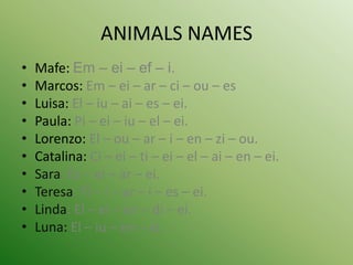 1. The document provides information about animal names spelled out letter by letter in Spanish and descriptions of characteristics of various animals.