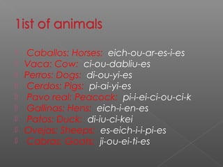 This document lists animals and their names in another language. It then provides short descriptions of horses, cows, dogs, pigs, peacocks, hens, ducks, sheep, goats, rabbits, and hamsters. It notes some of their physical characteristics and behaviors. The document also shares statistics about numbers of various animals housed in different areas, such as stables, yards, ponds, and reasons some may not like certain animals.