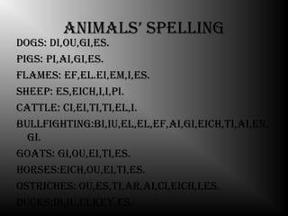 This document contains a presentation about animals' spellings in English and descriptions of different animal races at Panaca Sabana Park. It discusses dogs, pigs, flames, sheep, cattle, bullfighting, goats, horses, and ostriches. It then describes several individual animal races at the park: Shrek the donkey, Luna the horse, Mac-Peck the bronco, Salomon the romosinuano, Homero the harton valley, Chato the charbray, Pingüino the highlander, Tomas the guzerat, Manzana the chinese santander, and Mona the caq5ueta creole. It lists some species found in Panaca