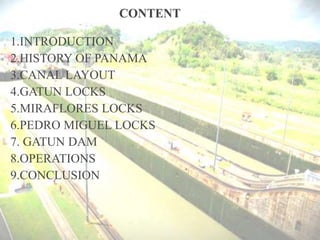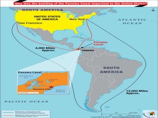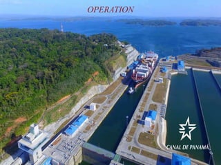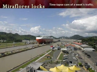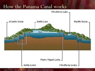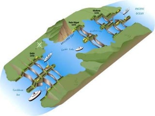The Panama Canal connects the Atlantic and Pacific oceans through an 82 km man-made waterway across the Isthmus of Panama. It features three sets of locks - Gatun, Miraflores, and Pedro Miguel locks. The locks raise and lower ships up to Gatun Lake, which ships traverse to cross the isthmus. The canal cuts the travel distance between the US West Coast and East Coast in half. It was constructed between 1904-1914 after earlier French attempts failed and has since been expanded to allow larger ships.