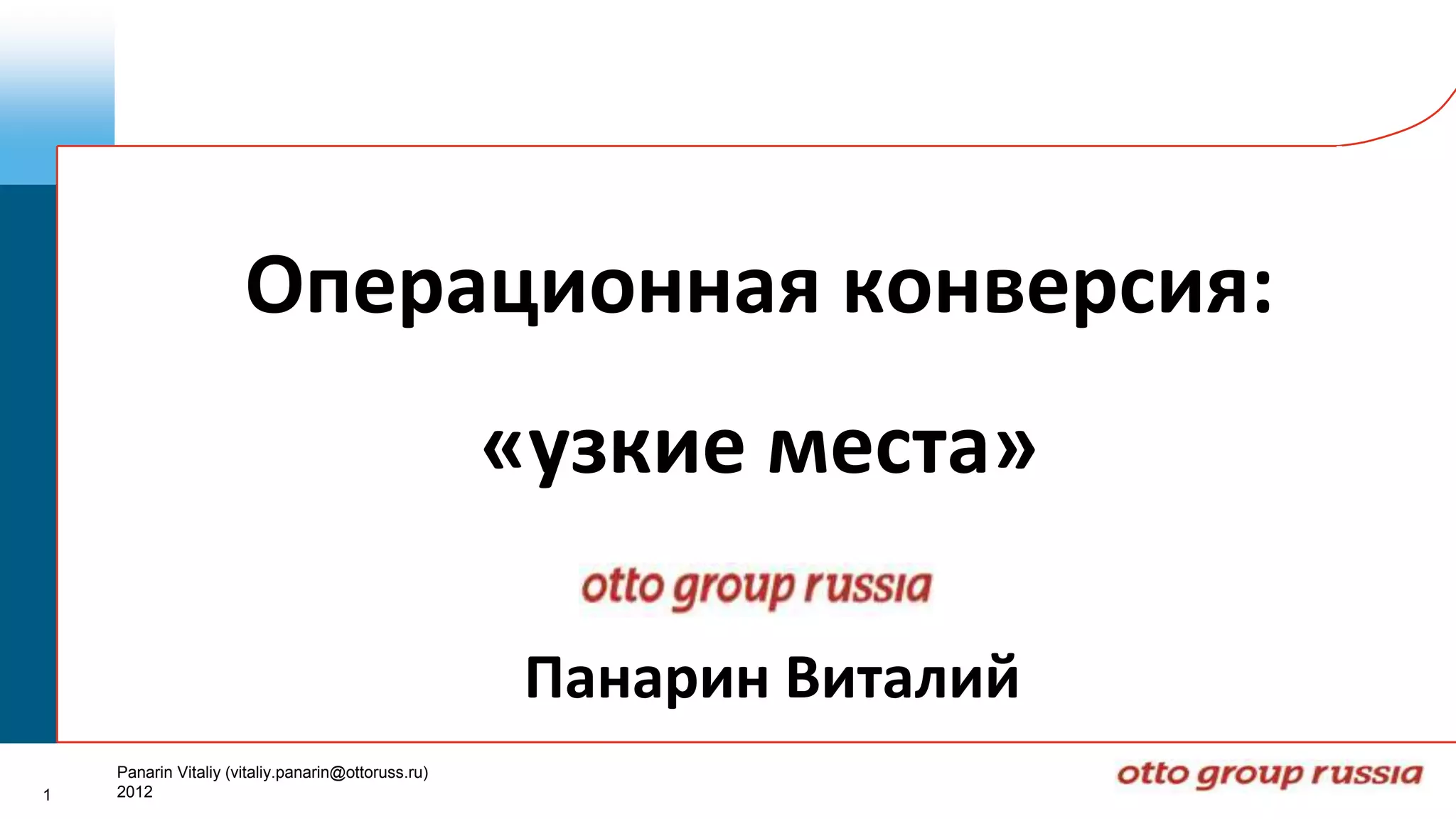 Документ содержит детали об операционной конверсии и факторах, влияющих на онлайн-ритейл, в частности на сайте Otto Group. Описаны действия пользователей на сайте и важные аспекты, зависящие от магазина, включая сервис, описание товаров и доверие к бренду. Также упоминаются не зависимые от магазина факторы, такие как доставка и работа call-центра.