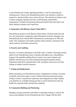 The document outlines the steps for developing a PancakeSwap clone script, highlighting the platform's key features such as automated market making, liquidity pools, and yield farming. It emphasizes the importance of planning, smart contract development, user interface design, and security measures while integrating with the Binance Smart Chain. Additionally, it stresses the need for thorough testing and community engagement to ensure the platform’s success.