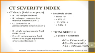 This document discusses pancreatitis, including its definition, types, causes, pathophysiology, signs and symptoms, diagnostic studies, complications, and management. Pancreatitis is inflammation of the pancreas that can damage the organ through premature activation of digestive enzymes. It can be acute, with rapid onset but potential reversibility, or chronic, resulting from irreversible structural changes over many years. Gallstones and alcohol are major causes. Diagnostic tests include blood tests, imaging like CT scans, and procedures like ERCP. Complications involve infection, pancreatic cancer, or nutritional issues. Treatment involves managing pain, treating underlying causes, and surgery in some cases. Nursing care focuses on pain management, fluid and nutrition management, and addressing related risks