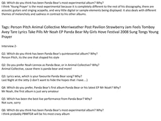 The interviews discuss various aspects of Panda Bear's music career, including preferences for different albums and roles. For quintessential album, most cite Person Pitch for defining Panda Bear's sound through sampling and mood shifts. Opinions vary on whether Panda Bear or Animal Collective is preferred, though many enjoy both. Experimental albums mentioned are Young Prayer and Person Pitch.