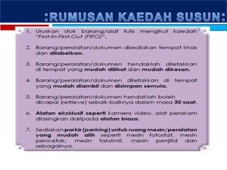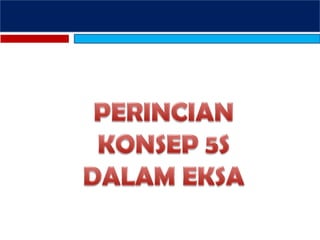 Dokumen ini membincangkan tentang Ekosistem Kondusif Sektor Awam (Eksa) yang berfokus kepada pengurusan persekitaran kerja yang bersih, teratur, dan cekap melalui amalan 5S. Ia menggariskan matlamat dan kaedah pelaksanaan Eksa termasuk penjenamaan, menyediakan persekitaran kerja kondusif, serta faedah-faedah yang dapat dicapai seperti meningkatkan imej agensi dan kecekapan pengurusan. Selain itu, dokumen ini menerangkan langkah-langkah untuk melaksanakan dan memantau pelaksanaan amalan serta proses pensijilan Eksa untuk agensi terlibat.
