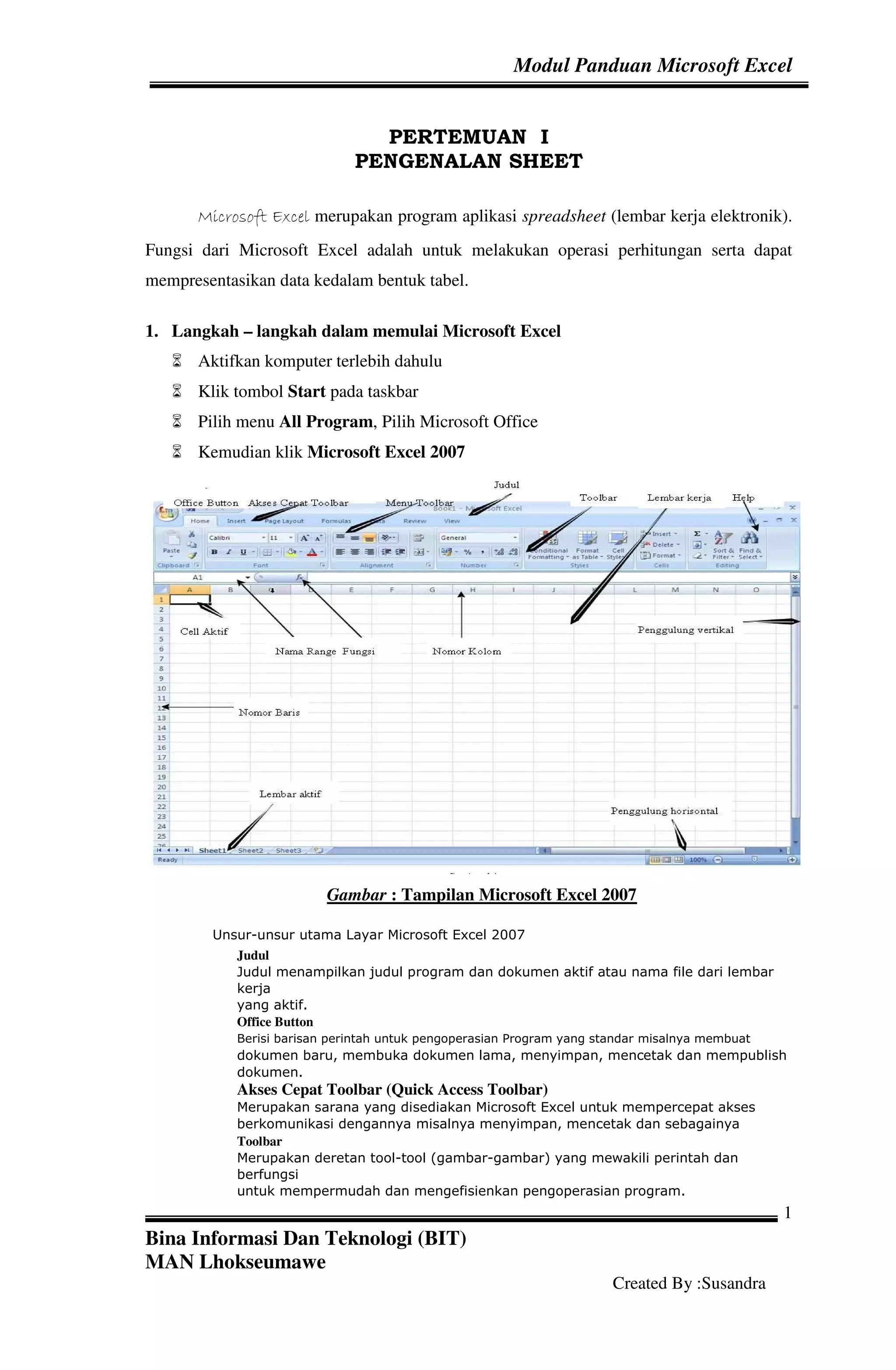 Dokumen ini adalah modul panduan Microsoft Excel yang mencakup pengenalan fitur-fitur dasar, cara menginput data, memformat kolom dan baris, serta menggunakan berbagai fungsi perhitungan dan logika. Selain itu, modul ini juga menjelaskan cara membuat grafik dan melakukan operasi pengolahan data seperti menyaring dan mengurutkan data. Setiap pertemuan dilengkapi dengan latihan praktis untuk memperkuat pemahaman pengguna.