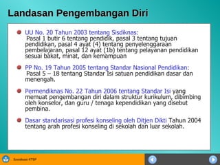 Dokumen ini adalah panduan pengembangan diri untuk satuan pendidikan dasar dan menengah yang menjabarkan pentingnya pengembangan karakter dan kepribadian peserta didik melalui konseling dan kegiatan ekstra kurikuler. Tujuannya adalah untuk membantu peserta didik mengembangkan bakat, minat, serta keterampilan sosial dan kehidupan. Selain itu, dokumen ini menguraikan berbagai jenis layanan konseling dan program kegiatan yang mendukung proses pengembangan diri.