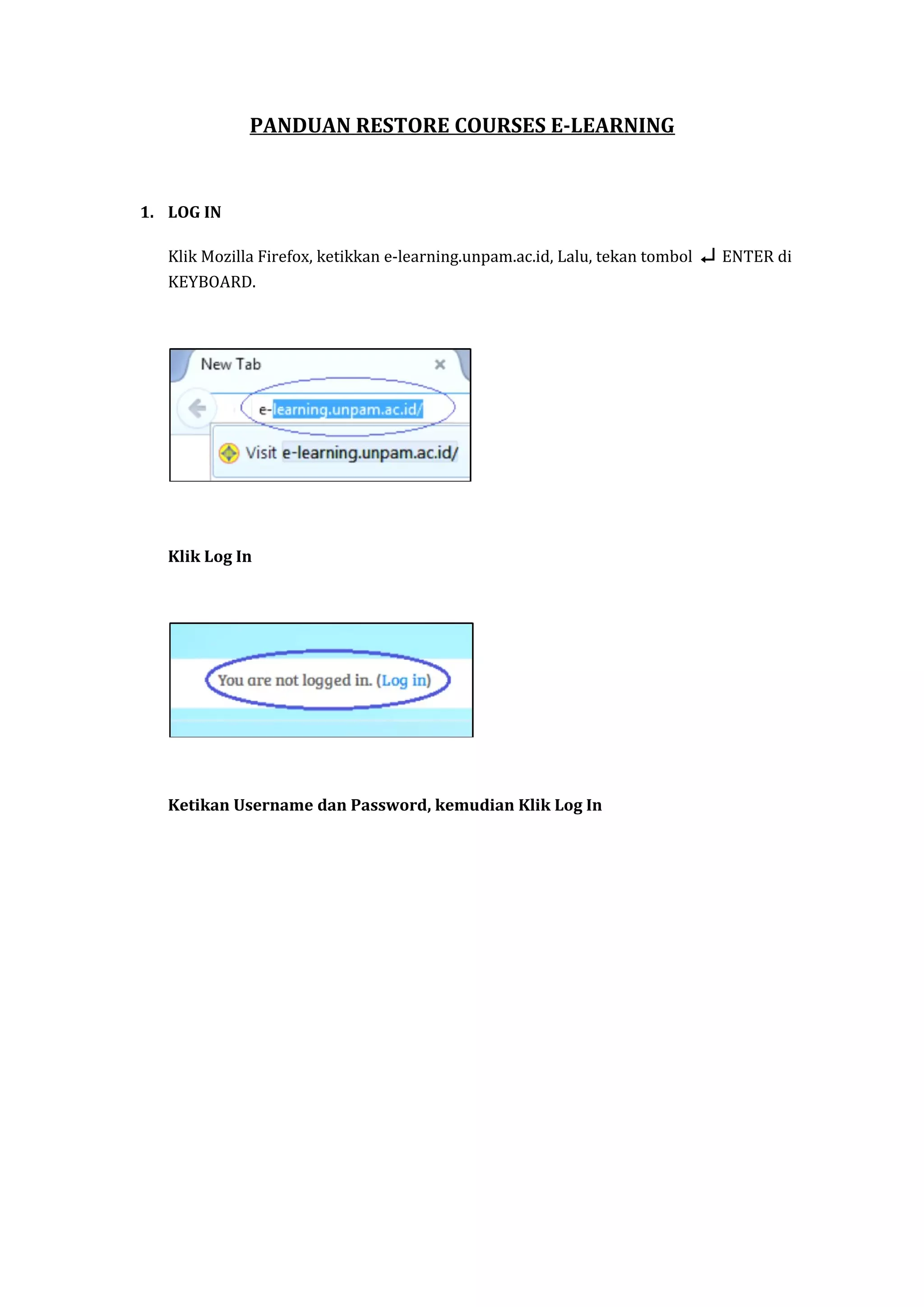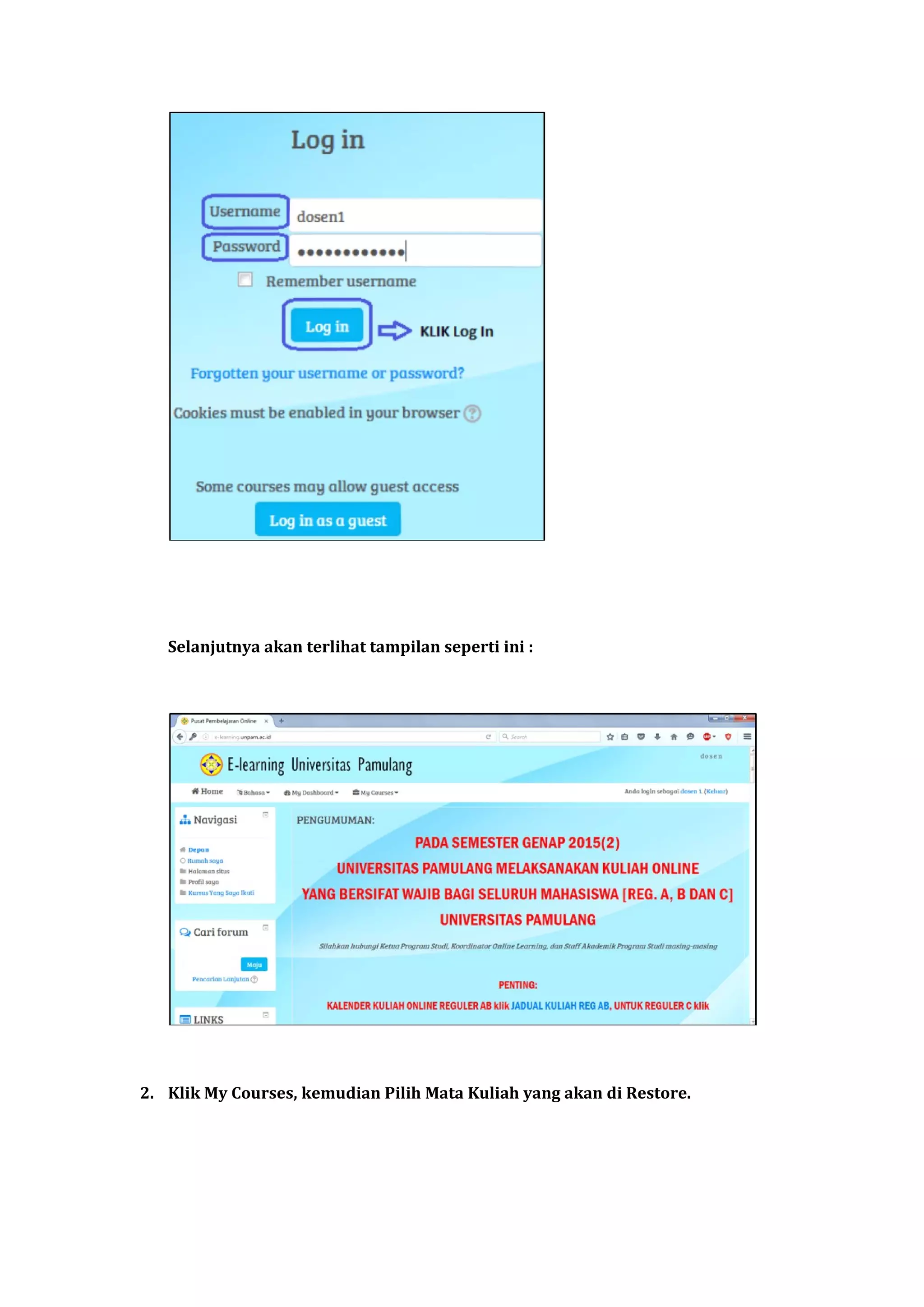 Dokumen ini merupakan panduan untuk merestore mata kuliah di e-learning Unpam. Prosesnya dimulai dari login, memilih mata kuliah, hingga mengunggah file backup dengan langkah-langkah detail dalam tujuh tahapan. Penting untuk memastikan pemilihan file dan jumlah SKS sesuai untuk menghindari kesalahan dalam proses restore.