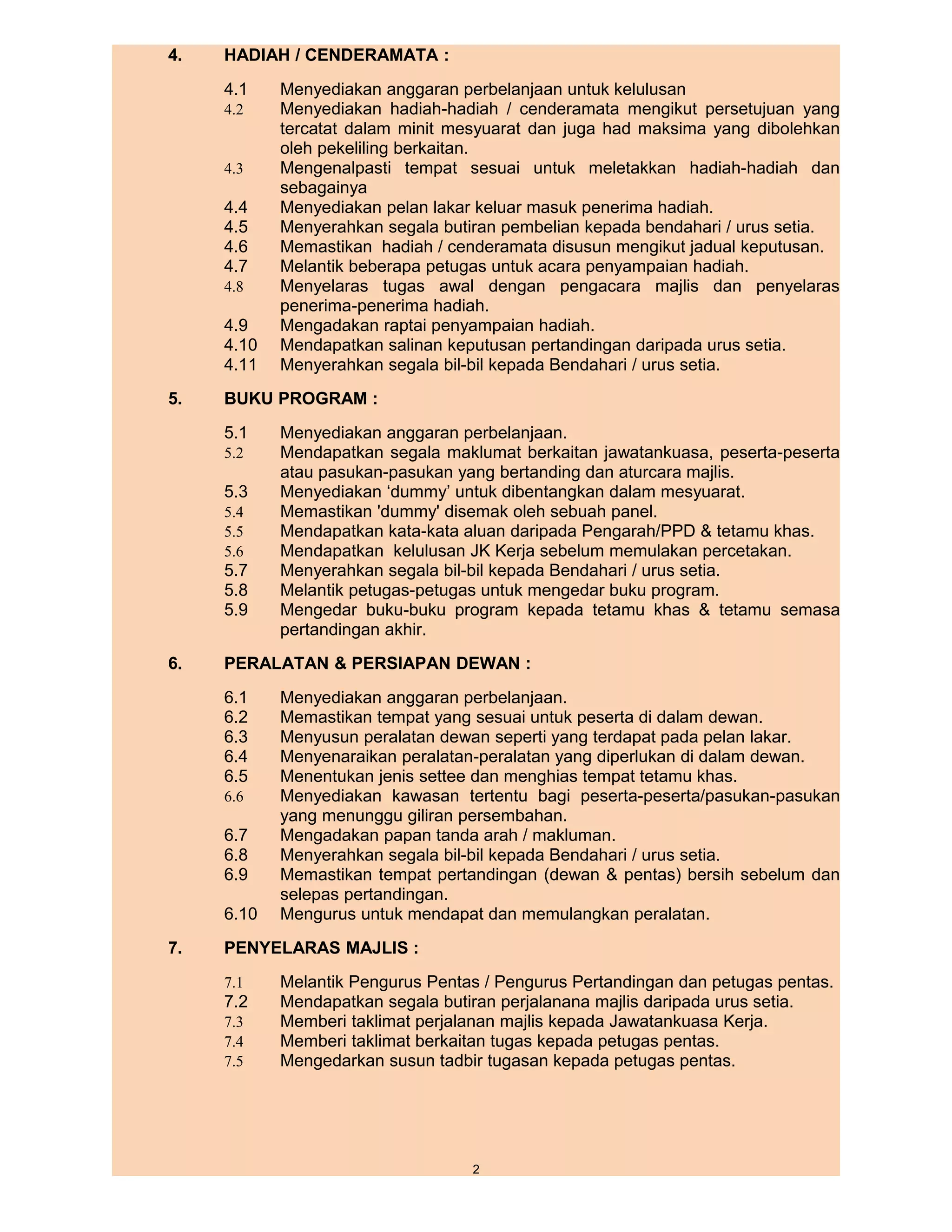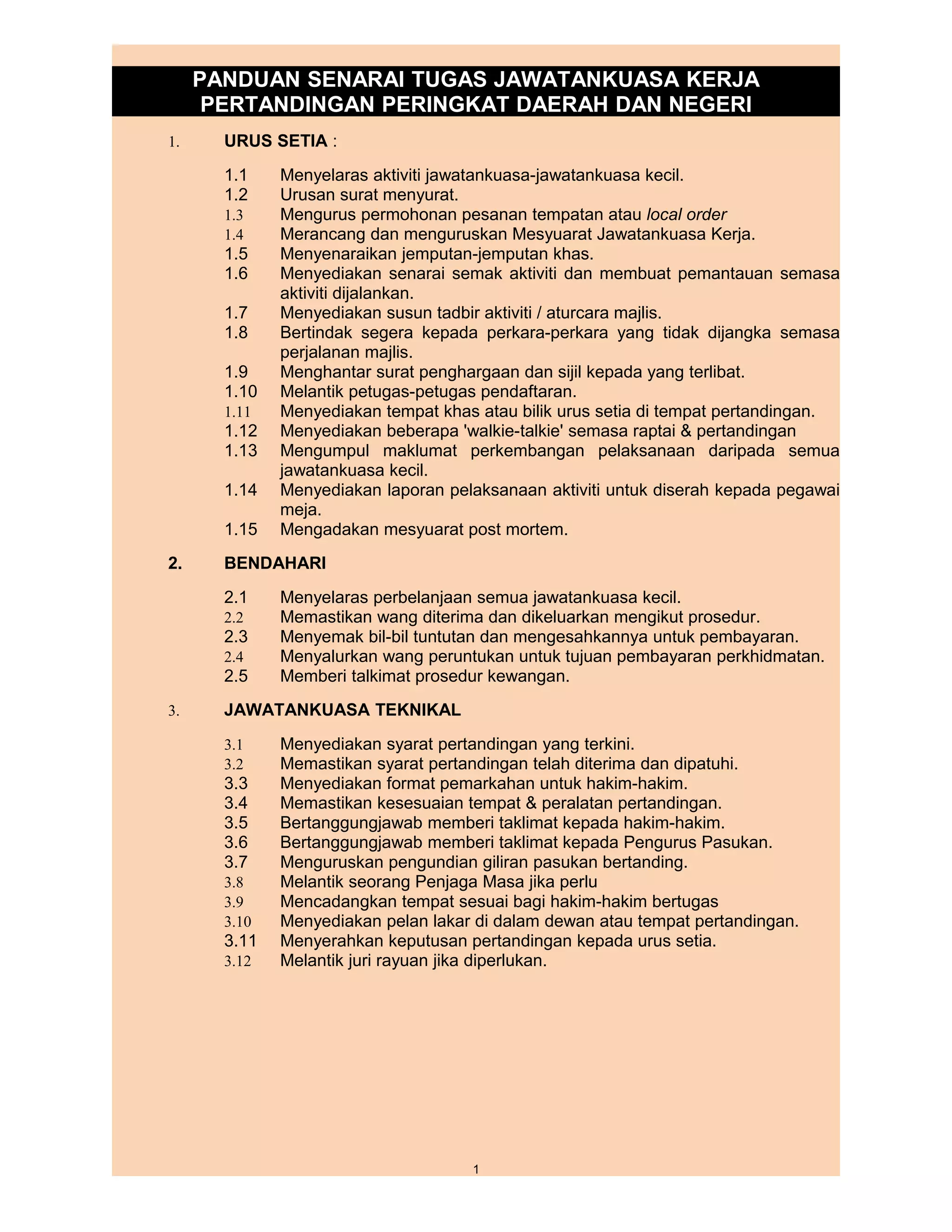 Dokumen ini merupakan panduan senarai tugas jawatankuasa kerja untuk pertandingan peringkat daerah dan negeri. Ia merangkumi pelbagai aspek seperti pengurusan, kewangan, teknikal, dan protokol bagi memastikan kelancaran acara. Setiap jawatankuasa diberikan tanggungjawab khusus seperti penyelarasan hadiah, penyediaan buku program, dan pengawalan keselamatan.