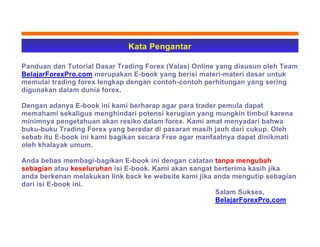 Dokumen ini adalah panduan dasar untuk trading forex yang mencakup konsep, istilah, dan cara kerja pasar forex. E-book ini bertujuan membantu trader pemula memahami risiko serta teknik trading sambil menekankan kelebihan trading forex dibandingkan investasi lainnya. Selain itu, panduan ini juga memberikan informasi tentang cara memulai trading dan pentingnya memilih broker yang aman dan terpercaya.