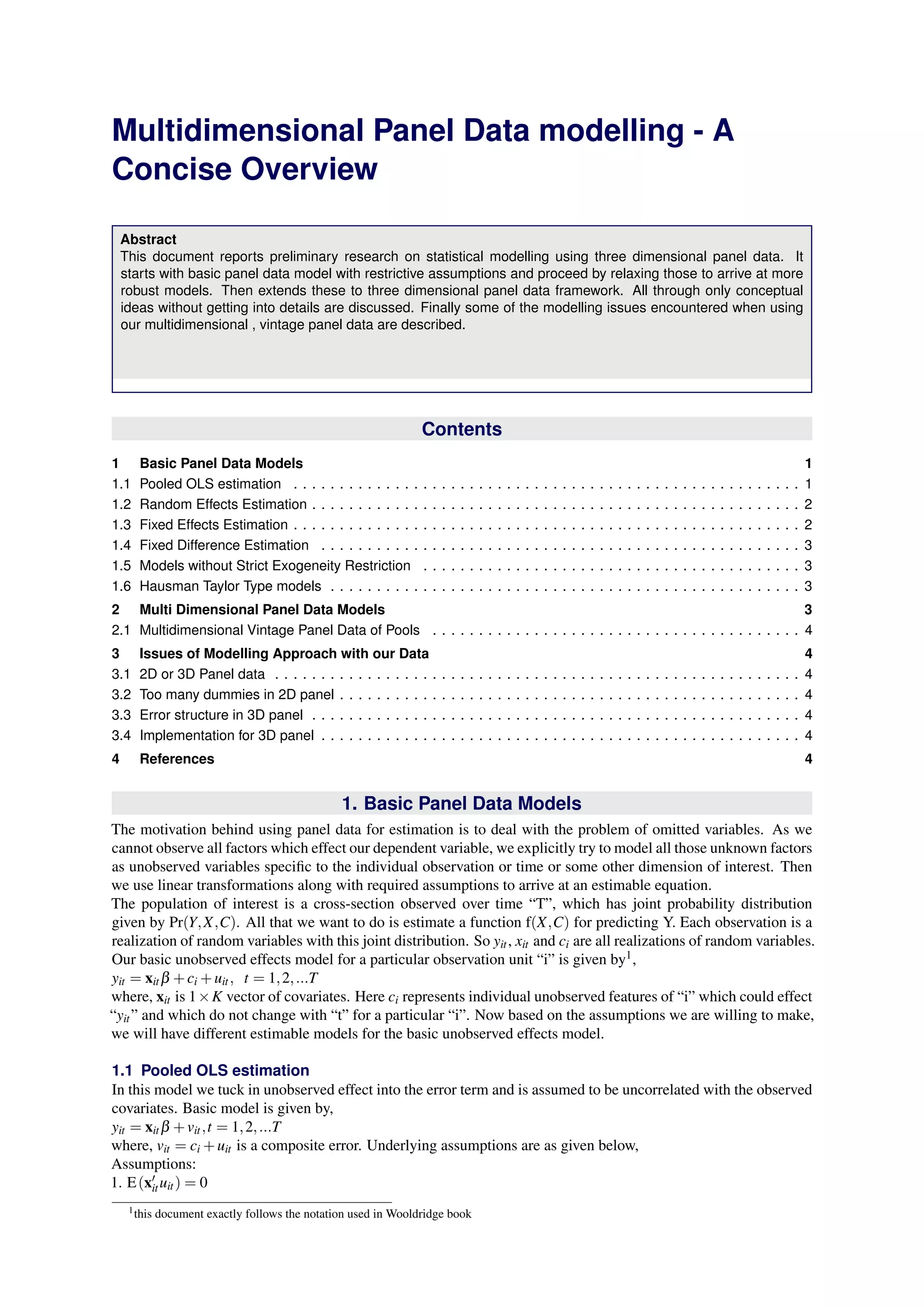 This document provides an overview of statistical modelling using multidimensional panel data. It begins by discussing basic panel data models that make restrictive assumptions, then relaxes those assumptions to develop more robust models. It extends basic models to a three-dimensional panel data framework. Finally, it describes some modelling issues that arise when using multidimensional vintage panel data, specifically relating to whether a two-dimensional or three-dimensional approach is best, dealing with too many dummy variables in a two-dimensional model, specifying the error structure in a three-dimensional model, and implementing estimation for a three-dimensional panel model.