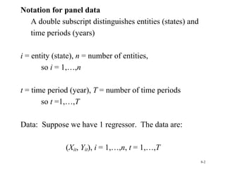 This document discusses panel data and methods for analyzing it. Panel data contains observations on multiple entities like individuals, states, or school districts that are observed at different points in time. This allows controlling for factors that are constant over time but vary across entities. Fixed effects regression is introduced as a method that eliminates the effect of any time-invariant characteristics. The document provides examples of how to specify fixed effects models using binary regressors or demeaning the data, and notes these produce identical estimates.