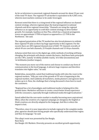 The document discusses opportunities for marketing in rural India and small towns. It notes that while metros dominate consumption in India, smaller towns and cities are growing rapidly and showing high consumption growth. Regional languages and channels also present significant opportunities, as nearly half of India's population lives outside major cities. The panel discussion highlighted that focusing on regional needs through local language, content and traditional media can be very effective for reaching and engaging customers outside of urban areas.
