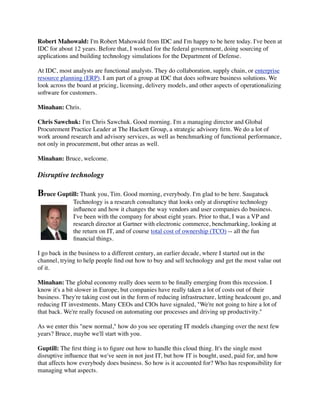The podcast discusses how cloud computing is transforming procurement and supply chain management, emphasizing the need for businesses to adapt to new operating models that leverage cloud services for efficiency and agility. Panelists highlight the trends in cost control, collaborative technologies, and working capital management as organizations seek to optimize their operations post-recession. The discussion reveals a shift from traditional cost-saving measures to a broader value proposition that includes better alignment between procurement and financial strategies.