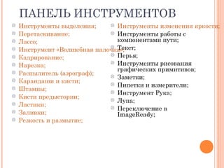 Документ описывает панель инструментов Adobe Photoshop и функции различных инструментов, таких как выделение, перемещение, рисование и изменение яркости. Каждый инструмент представлен с его назначением и способами использования, включая лассо, штампы, заливки и текст. Информация охватывает как основные функции, так и специальные инструменты для редактирования изображений.