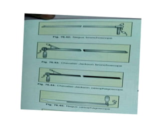 This document provides information on various endoscopic procedures used in diagnosing and treating conditions of the nasal cavity, throat, esophagus, and lungs. It describes the indications, contraindications, procedures, and potential complications of nasal endoscopy, videolaryngoscopy, esophagoscopy, bronchoscopy, and nasopharyngoscopy/rigid pharyngolaryngoscopy. Key details covered include the diagnostic and therapeutic uses of each scope, as well as size recommendations for pediatric versus adult procedures.