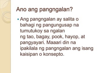 Ang pangngalan ay salitang tumutukoy sa ngalan ng tao, bagay, pook, hayop, at pangyayari, at nahahati ito sa pambalana at pantangi. Ang mga pangngalan ay maaari ring pag-uriin batay sa katangian, kayarian, kasarian, at kailanan, na may kani-kaniyang halimbawa at paliwanag. Ang pagkakaintindi sa iba't ibang uri at aspekto ng pangngalan ay mahalaga sa wastong paggamit ng wika.