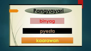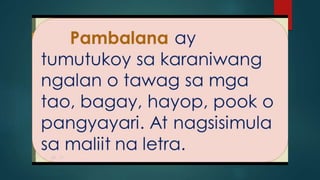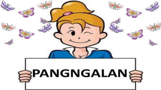 Ang pangngalan ay tumutukoy sa ngalan ng tao, bagay, hayop, lugar, at pangyayari. May dalawang uri ito: pangngalang pantangi na gumagamit ng mga tanging pangalan at isinusulat sa malaking letra. Ang mga halimbawa ng pangngalan ay kinabibilangan ng tao, hayop, at mga espesyal na araw.