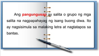 Ang pangungusap ay isang grupo ng mga salita na nagpapahayag ng diwa, na nagsisimula sa malaking letra at nagtatapos sa bantas. Ito ay binubuo ng dalawang bahagi: ang simuno, na paksa ng pangungusap, at ang panaguri, na naglalarawan sa simuno. Nagbigay ng mga halimbawa ng mga pangungusap at mga salitang may salungguhit, na tumutukoy sa simuno at panaguri.