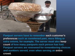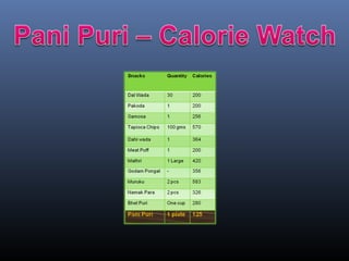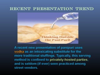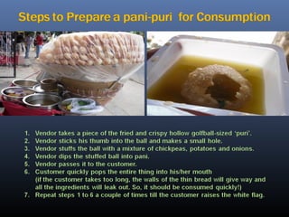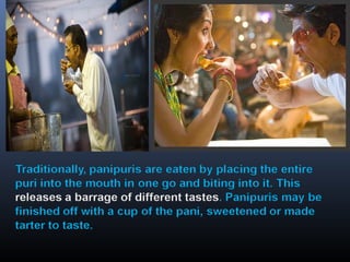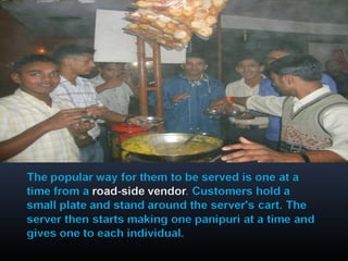 Pani Puri is a popular Indian snack consisting of a round, hollow puri (fried bread) used to hold spiced water and fillings. It can be customized with different fillings and spices to individual tastes. Pani Puri is also known as a healthy snack that helps clear the digestive system. The document also shares an inspiring story of a pani puri vendor who supported his wife's education through his earnings, enabling her to become a software engineer.