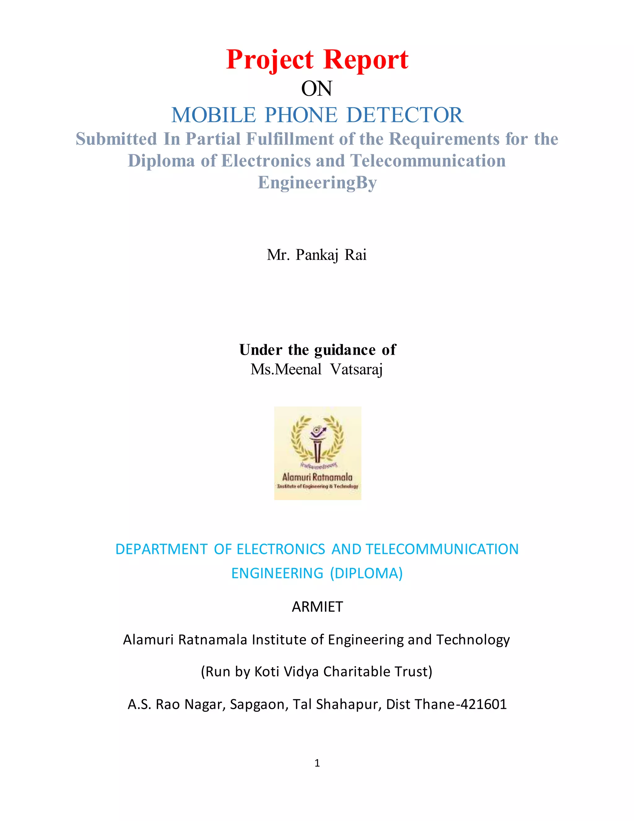 The document describes the design and development of a mobile phone detector circuit. It begins with background information on the need for detecting mobile phones in restricted areas. It then discusses the history of mobile phone detection and technologies like GSM, 3G and 4G. The document provides an overview of the mobile phone detector project and explains the motivation was to prevent phone use in exams and confidential areas. It describes different detector designs and the basic components and workings of a detector circuit to identify activated phones from 1.5 meters away based on radio frequency signals.