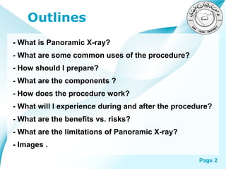 Panoramic radiography, also called a panoramic x-ray, captures a single image of the entire mouth, including teeth, jaws, and surrounding structures. It is commonly used by dentists and oral surgeons to evaluate bones, teeth, and check for issues like tumors, cysts, or impacted teeth. The procedure involves a rotating x-ray tube that projects a beam through the patient's head and onto a rotating film or detector. It is painless, fast, and provides a wider view than intraoral x-rays. While it does not show the same detail as other imaging tests, panoramic x-rays are useful for initial evaluation of dental problems.