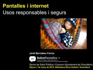 Jordi Bernabeu FarrúsServei de Salut Pública i Consum (Ajuntament de Granollers) Dijous 1 de març de 2012. Biblioteca Roca Umbert. Granollers. Pantalles i internet Usos responsables i segurs
