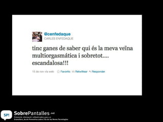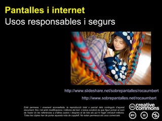 http://www.slideshare.net/sobrepantalles/rocaumbert http://www.sobrepantalles.net/rocaumbert Està permesa, i vivament aconsellada, la reproducció total o parcial dels continguts d’aquest document, fins i tot amb modificacions i millores del text. L'única condició és que figuri primer el nom de l'autor i/o les referències a d’altres autors i després el de tots els qui hi hagin introduït millores. Totes les còpies han de portar aquesta nota de copyleft. No estan permesos els usos comercials Pantalles i internet Usos responsables i segurs