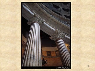 PANTEÓ D’AGRIPA ROMA Títol : Panteó Autor : desconegut (comitent i possible inspirador de l’obra: l’emperador Adrià Cronologia : 118-128 Estil : Romà Imperial Tipologia : temple Sistema constructiu: arquitravat i voltat Materials : formigó, granit, maó, marbre i fusta Loclització : Camp de Mart Dimensions: pòrtic, 35m ample; columnes, 18 m. Alt; tambor 58 m. diàmetre; cúpula, 43,2 m alt MERCÈ BIGORRA IES. MOIANÈS