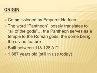 The Pantheon dome in Rome is the oldest unreinforced concrete dome in the world, built between 118-128 AD. It has a depth and width of 142.4 feet, configured as a perfect sphere. To support the massive weight of the dome, the Romans built 20 foot thick concrete walls and used innovative techniques to reduce the dome's weight, such as using pozzolans and amphra in the concrete mix and adding coffering. The oculus opening distributes stresses at the dome's weakest point. The Pantheon's concrete design has enabled the 142 foot tall dome to remain intact for nearly 2,000 years.