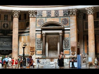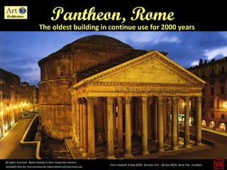 The document summarizes key details about the Pantheon in Rome, including that it was built between 118-125 AD during the reign of Emperor Hadrian, making it nearly 2,000 years old. It functions architecturally through its large concrete dome without reinforcing, portico entrance, and oculus opening at the top. The building was later converted to a church in 609 AD and contains tombs of notable people like Raphael.