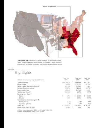 The Pantry had a very successful fiscal year 1999, achieving strong growth and financial results. They completed several major acquisitions, expanding their store count to 1,274 stores across 8 states. Total revenues increased 71% to $1.68 billion from fiscal year 1998. Net income was $14 million compared to $4.67 million in 1998. The company's IPO in June 1999 strengthened their balance sheet and allowed them to continue an aggressive acquisition strategy to take advantage of opportunities in the fragmented convenience store industry.