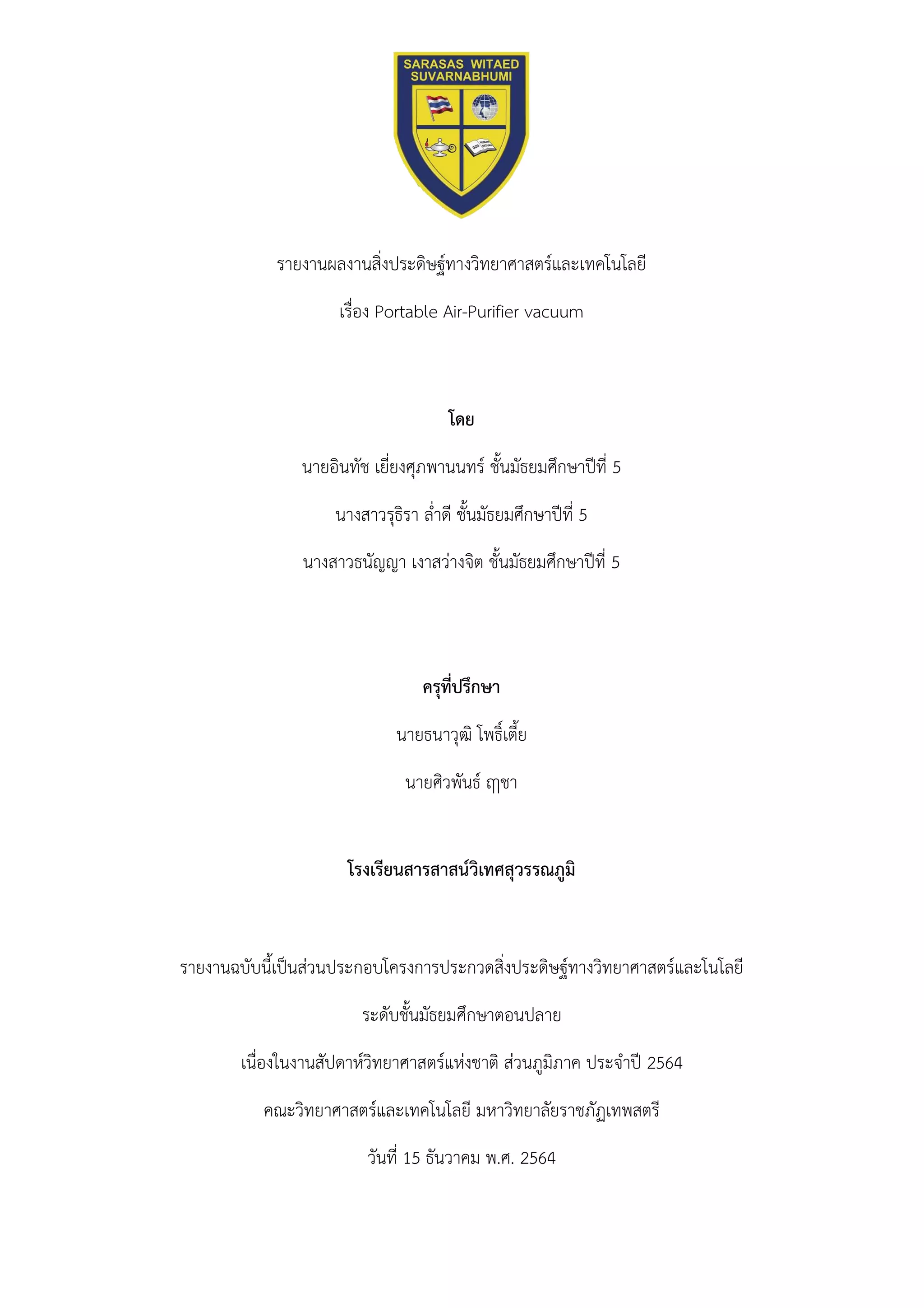 รายงานฉบับนี้เป็นส่วนหนึ่งของการแข่งขันสิ่งประดิษฐ์ทางวิทยาศาสตร์และเทคโนโลยี ของมหาวิทยาลัยเทพสตรี ประจำปีการศึกษา 2564