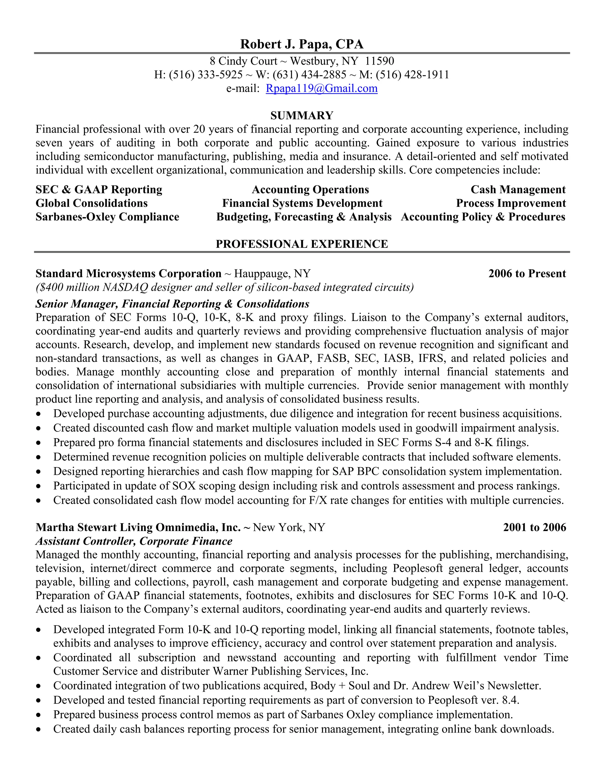 The document summarizes the professional experience of Robert J. Papa, including over 20 years of experience in financial reporting, accounting, and auditing. He has worked in various industries and held roles with increasing responsibility, most recently as Senior Manager of Financial Reporting and Consolidations at Standard Microsystems Corporation. His core competencies include SEC and GAAP reporting, accounting operations, and Sarbanes-Oxley compliance.