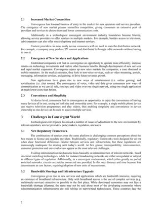 Technological convergence refers to the integration of telecommunications, information technology, and media sectors that were originally separate. It presents both opportunities and challenges. Key opportunities include increased market competition through lower barriers to entry, new services and applications, and convenience through multifunction devices. However, convergence also poses challenges such as developing new regulatory frameworks, upgrading infrastructure to support bandwidth-intensive new services, strategic realignment for operators and providers, and ensuring security, privacy and reliability with increased network complexity. Overall, convergence offers potential for new value-added services and expanded markets if these challenges are adequately addressed.