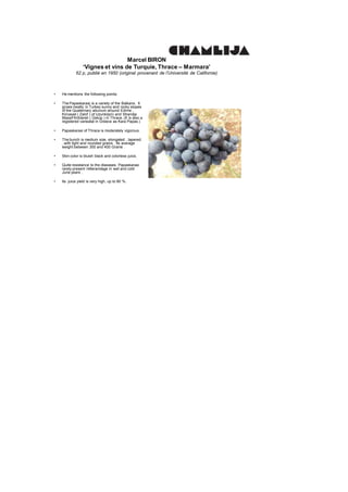 The document summarizes information about the Papaskarasi grape variety, including: