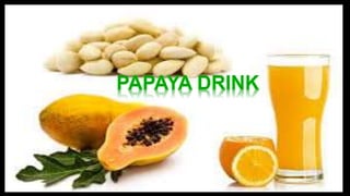 This document provides an overview of papaya, including its classification, origins, main active ingredients, health benefits, mechanisms of action, nutrition facts, and potential side effects. Papaya contains several proteolytic enzymes such as papain and chymopapain that aid in protein digestion. It also has antioxidant and anti-inflammatory properties that may help reduce risks of certain cancers and lower blood pressure and cholesterol. Potential side effects include skin irritation, increased bleeding risk when taken with blood thinners, and unsafe consumption during pregnancy or breastfeeding.