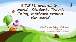 Eirini-Anthi Papazachariou is a primary school teacher from Rhodes, Greece. She teaches 3rd grade at the 5th Primary School of Rhodes. Rhodes is the largest island of the Dodecanese islands in Greece, where the population is around 10.8 million people and Athens is the capital city. She introduces her classroom, which is the C2 - 3rd Grade classroom at the 5th primary school of Rhodes.