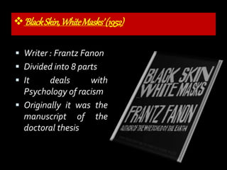 The document discusses Frantz Fanon's 'Black Skin, White Masks,' focusing on the psychology of racism and the implications of color in society. It emphasizes the internalized mindset around race, arguing that humanism, rather than color, is essential for addressing racial discrimination. The author concludes that racial prejudices are mental constructions, advocating for a questioning attitude toward these issues.