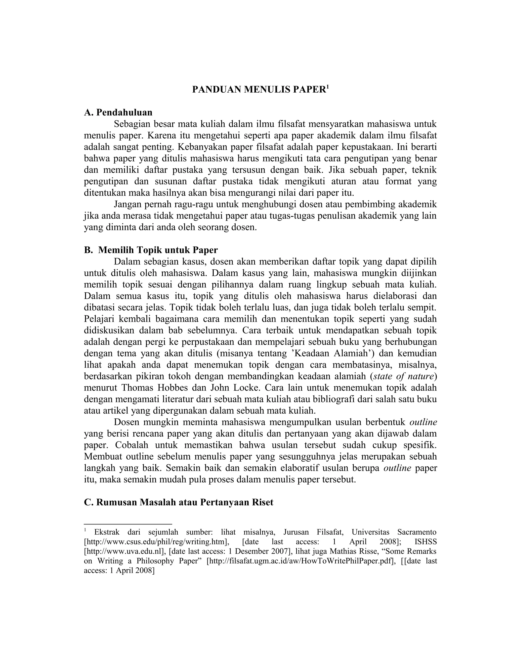 Dokumen ini merupakan panduan tentang penulisan paper di bidang filsafat, mencakup pentingnya mengikuti format penulisan dan pengutipan yang benar, serta cara memilih dan membatasi topik. Selain itu, panduan ini menjelaskan aspek penting dari rumusan masalah, pernyataan tesis, dan struktur paper yang diharapkan, termasuk pembuatan argumen dan kesimpulan yang efektif. Penulis juga diingatkan tentang plagiarisme dan pentingnya memberikan penghargaan terhadap sumber-sumber yang digunakan.