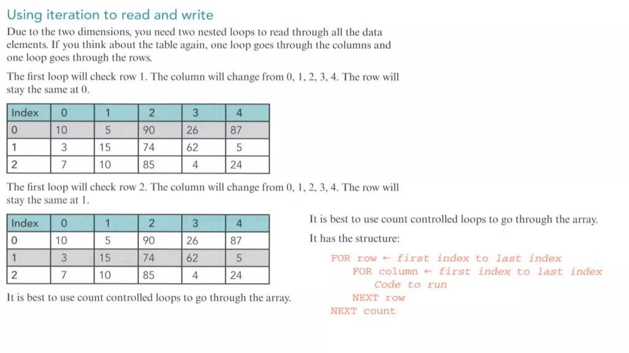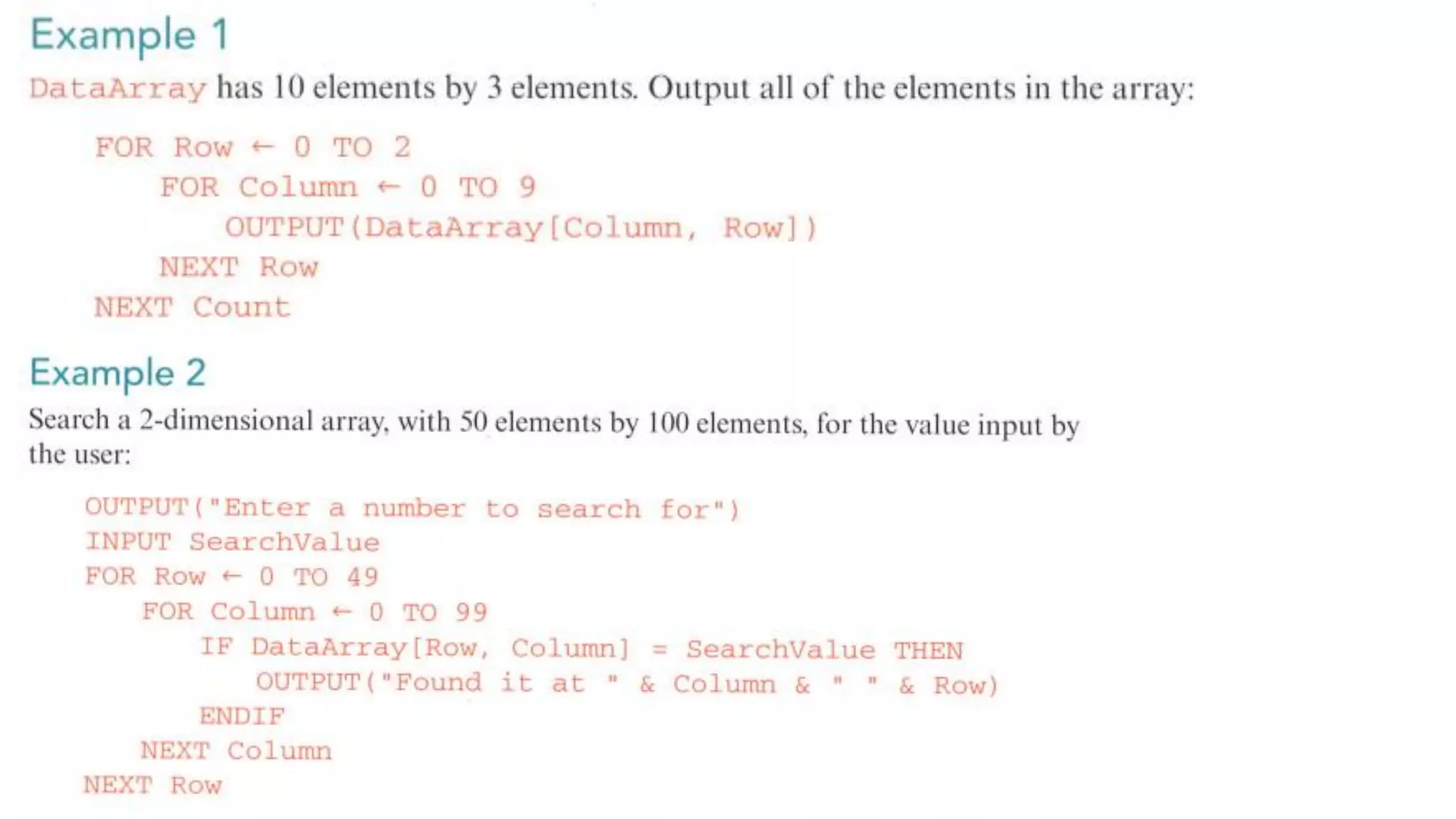 This document provides an overview of various computer science concepts including data types, loops, linear search, bubble sort, 2D arrays, files, stacks, queues, and linked lists. Key algorithms like linear search and bubble sort are explained with examples of pseudocode. Different data structures such as arrays, stacks, queues and linked lists are also introduced along with their core operations.