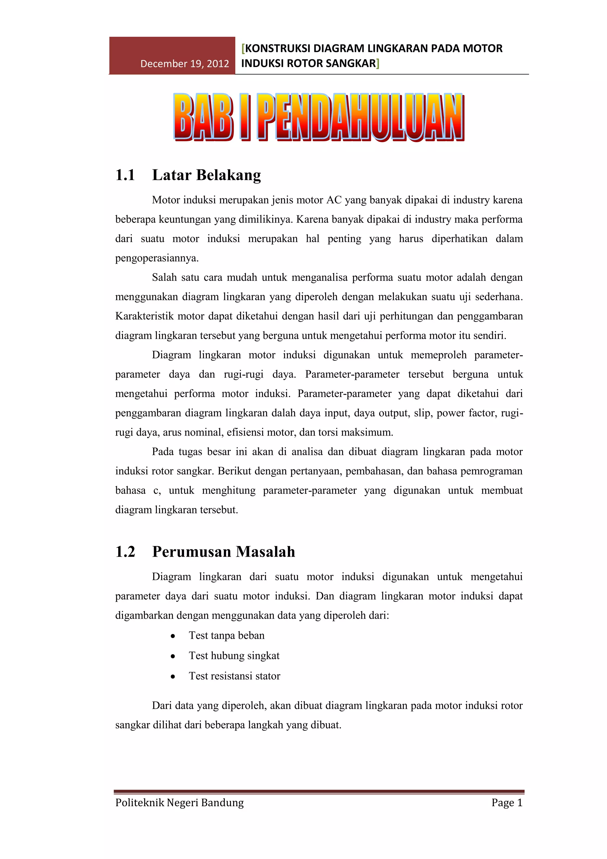 Dokumen ini membahas tentang konstruksi diagram lingkaran pada motor induksi rotor sangkar, termasuk analisis performa motor dan berbagai parameter daya seperti efisiensi, torsi maksimum, dan rugi-rugi daya. Penggunaan diagram lingkaran mempermudah analisis dan perhitungan motor induksi dengan metode pengujian tertentu. Selain itu, dokumen menyertakan penjelasan tentang perbedaan antara rotor sangkar dan rotor belitan, serta langkah-langkah dalam pembuatan diagram lingkaran.