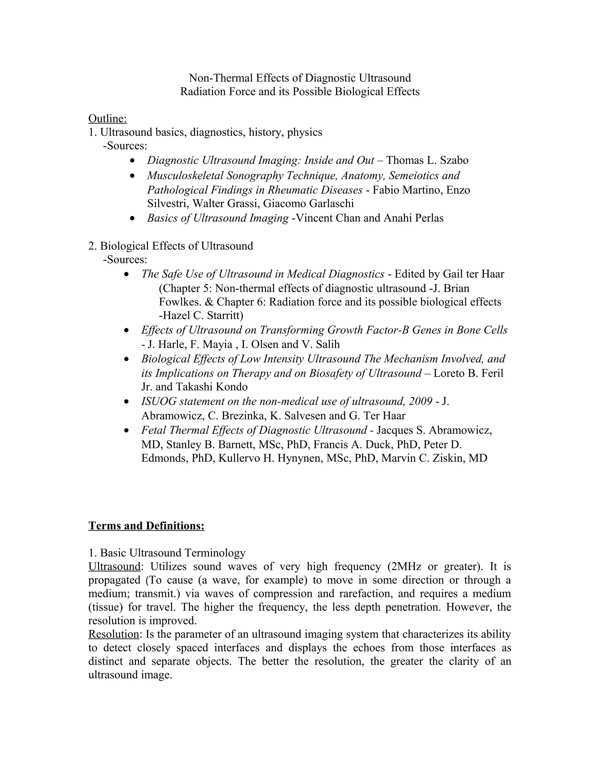 This document discusses non-thermal effects of diagnostic ultrasound, specifically radiation force and its potential biological effects. It outlines ultrasound basics and physics, defines key terms, and explores mechanical effects not related to heating, including cavitation, acoustic radiation force, and acoustic streaming which can cause fluid movement. Observations of effects on bone, lung, heart, perception, and development are provided, such as ultrasound accelerating bone healing and potentially altering neural migration through radiation force.