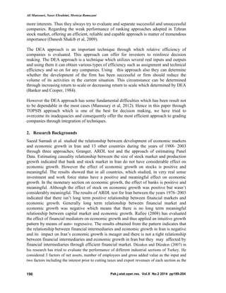 This document describes a study that uses an integrated TOPSIS-DEA approach to rank cement companies listed on the Tehran Stock Exchange. The study evaluates 28 cement companies from 2006-2012 using both qualitative and quantitative data. Financial ratios and other data are used as inputs and outputs in the TOPSIS-DEA model. The hybrid model aims to provide a more accurate ranking by combining the advantages of the TOPSIS and DEA methods. When the results were presented to stock market experts, most felt the integrated approach provided a better ranking of company performance than quantitative or qualitative approaches alone.