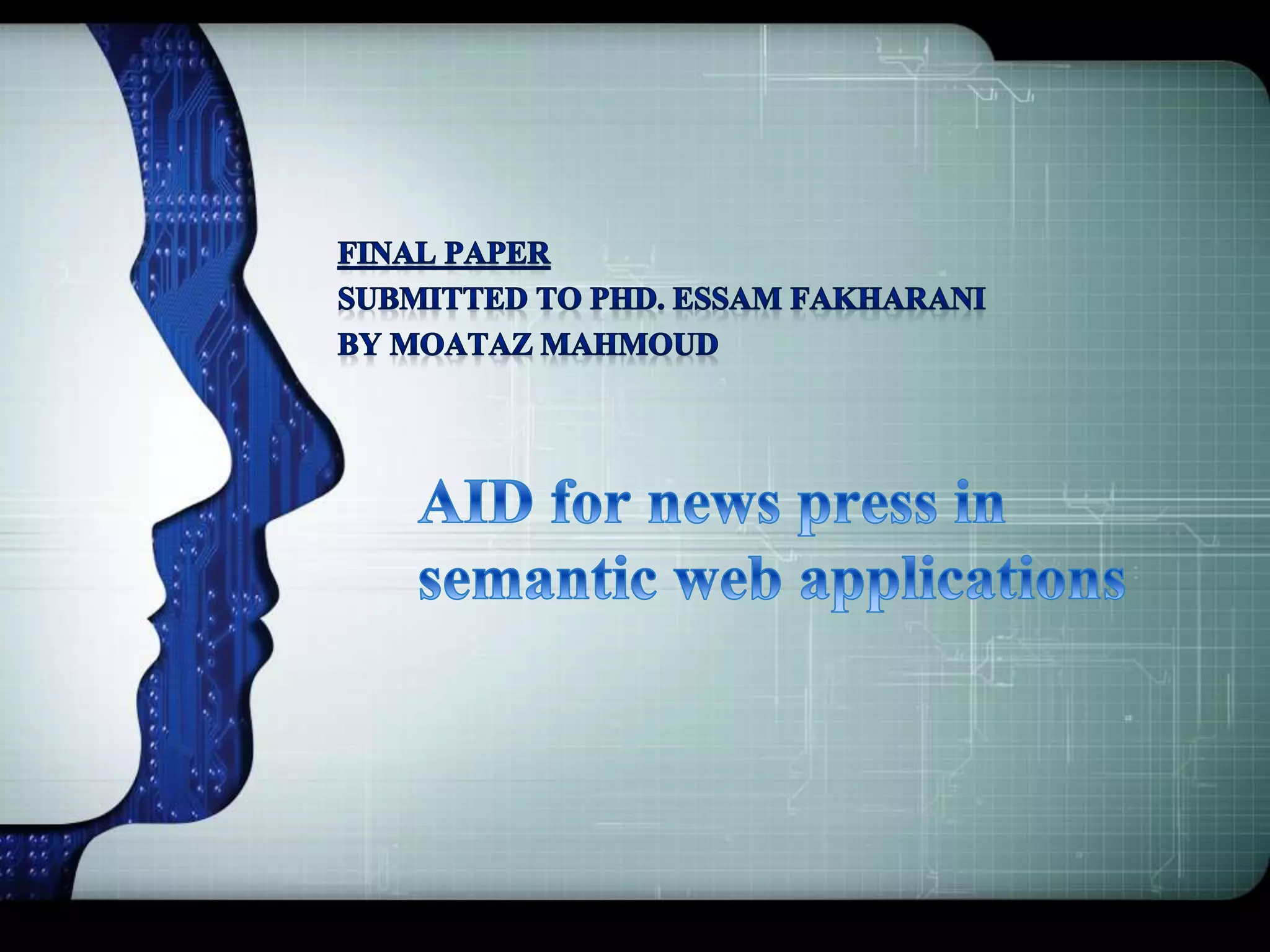 This document discusses the key components of an RSS news aggregator project including the motivations, objectives, technical framework, and issues with existing keyword-based search approaches. It outlines the proposed solution of using concept maps and ontologies to represent news semantics and allow retrieval based on partial meaning matching rather than exact keyword matching. Details are provided on collecting news from RSS feeds, representing it based on user-submitted keywords, eliminating duplicates, and enabling semantic search through correlation computation between concept vectors.